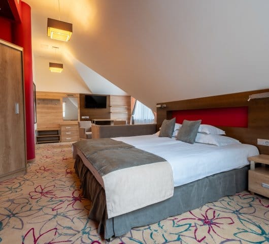 Dzień zaczyna się od bogatego bufetu śniadaniowego, gdzie dzieci mogą same komponować swoje ulubione posiłki. Na obiady i kolacje zapraszamy do restauracji Oberża, która oferuje menu przyjazne także najmłodszym gościom. A jeśli ktoś woli domowe smaki, apartamenty wyposażone są w aneksy kuchenne – z pełną swobodą gotowania, choć zawsze można skorzystać z hotelowych propozycji.